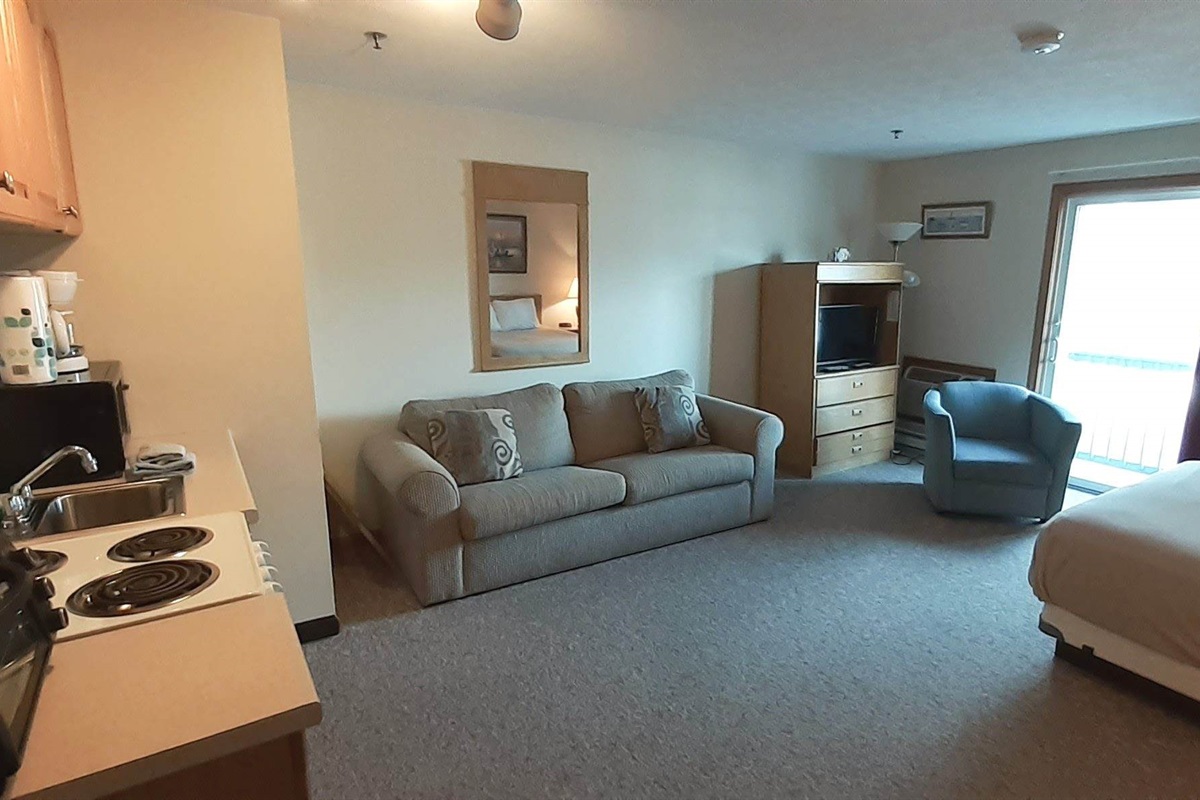 This studio unit has a queen bed and a pull out sleeper sofa. Unit comes equipped with kitchenette, including mini-refrigerator and apartment sized stove/oven. Color Cable TV and DVD. Shower stall in bath. This unit has a private balcony. Air Conditioned.