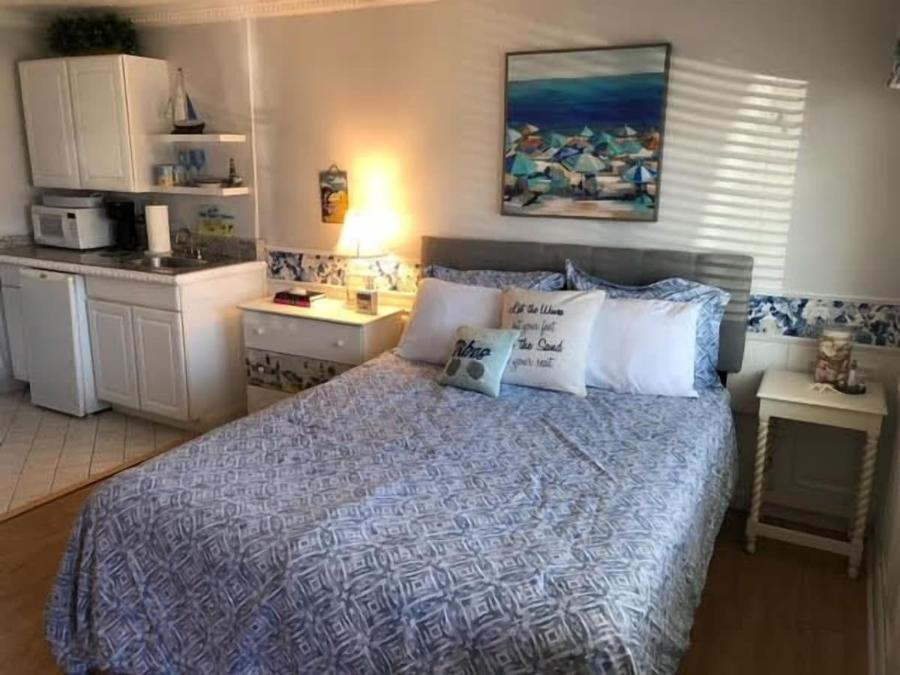 This courtyard studio unit has 1 queen bed. Units come equipped with kitchenette, including mini-refrigerator and microwave. Color Cable TV and DVD. Full shower stall in bath. Air Conditioned.