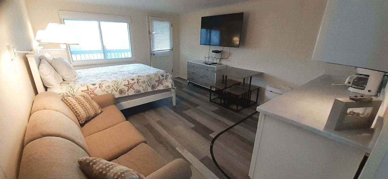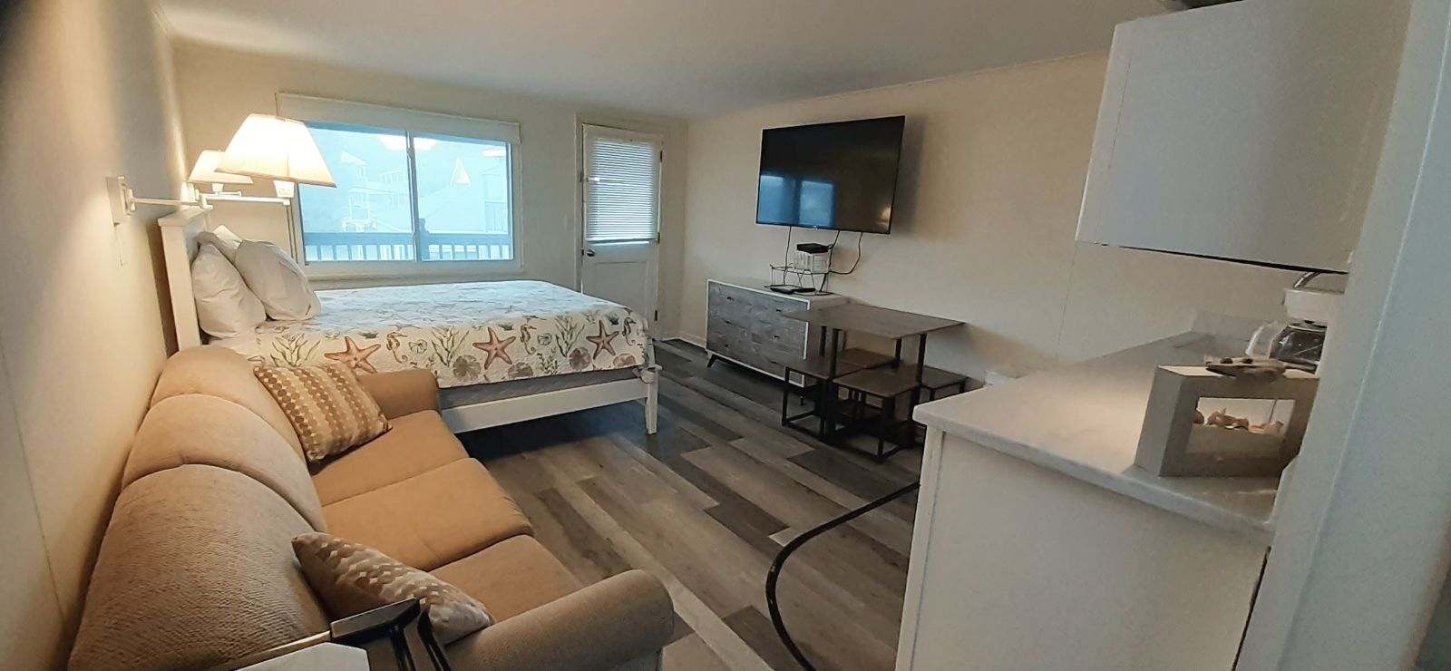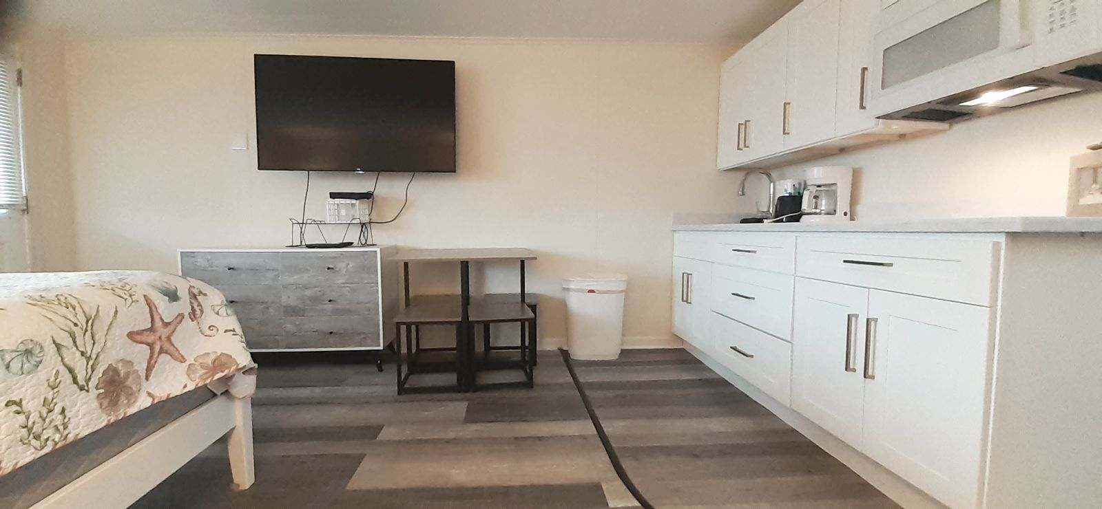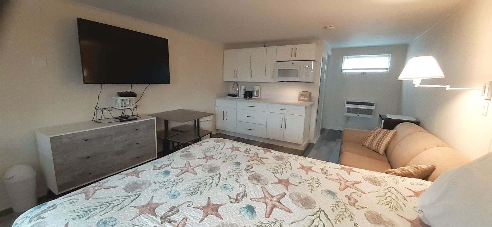 Courtyard studio unit has 1 queen bed and 1 pullout sofa bed. Unit comes equipped with kitchenette, including mini-refrigerator and microwave. Color Cable TV and DVD. Full tub/shower in bath. Air Conditioned.