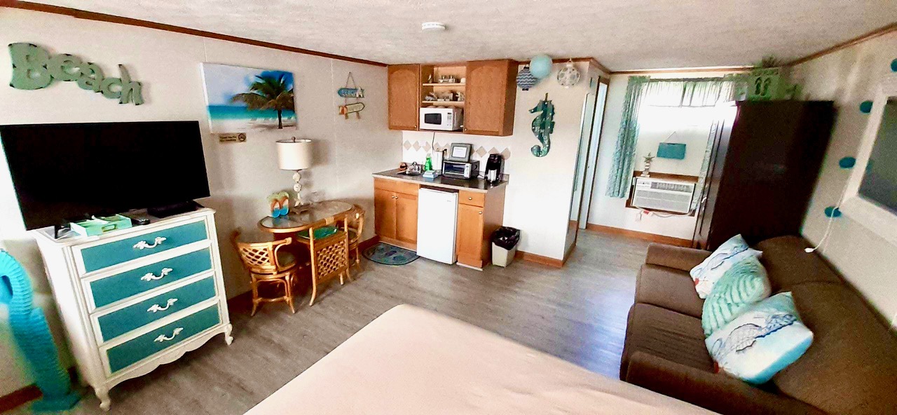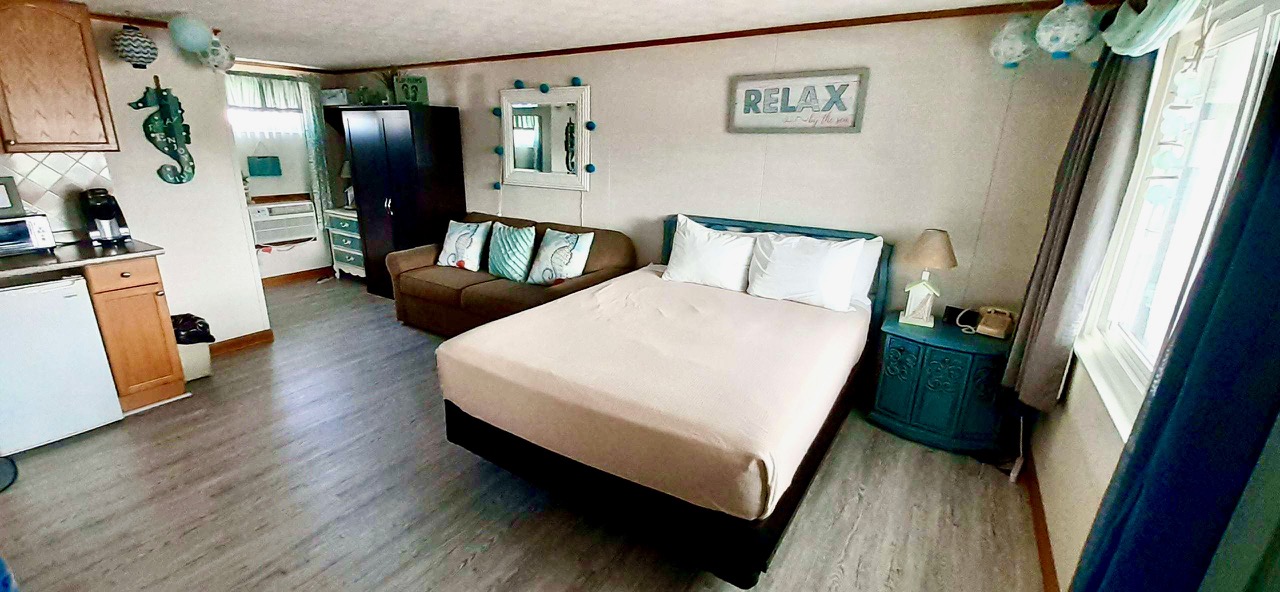 Courtyard studio unit has 1 queen bed and 1 pullout sofa. Unit comes equipped with kitchenette, including mini-refrigerator and microwave. Color Cable TV and DVD. Full tub/shower in bath. Air Conditioned.