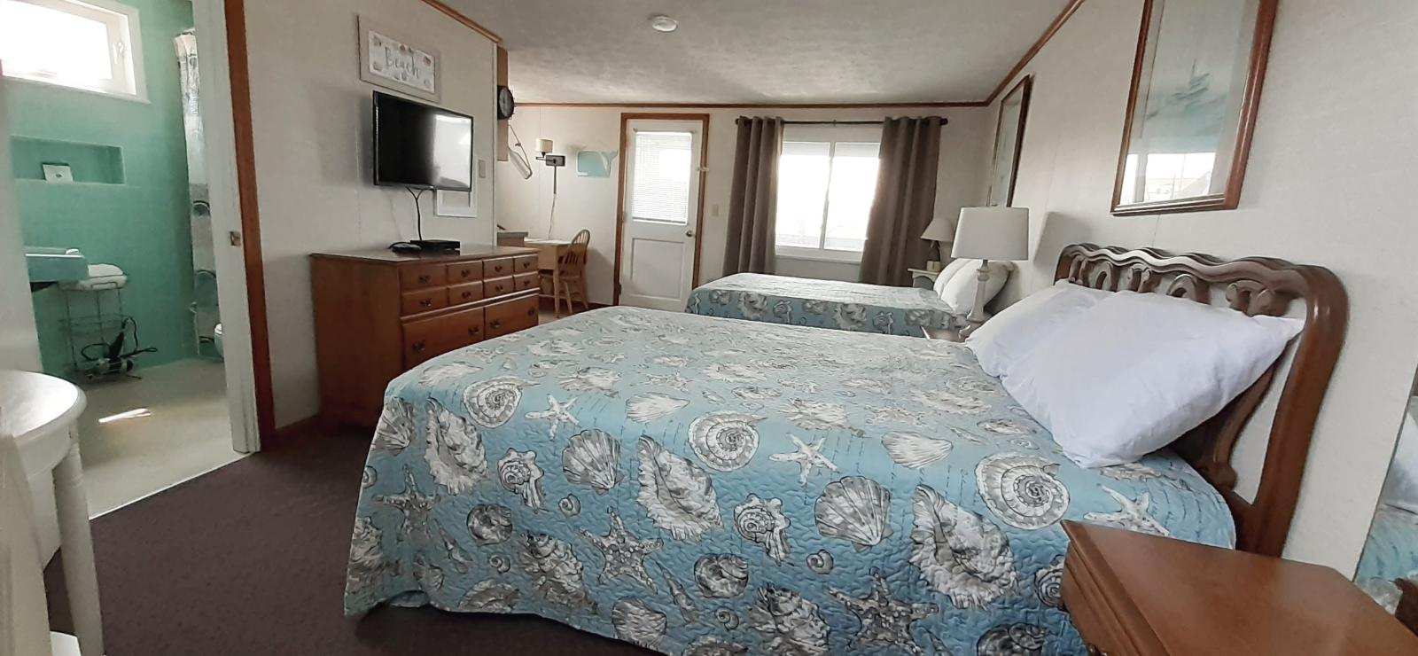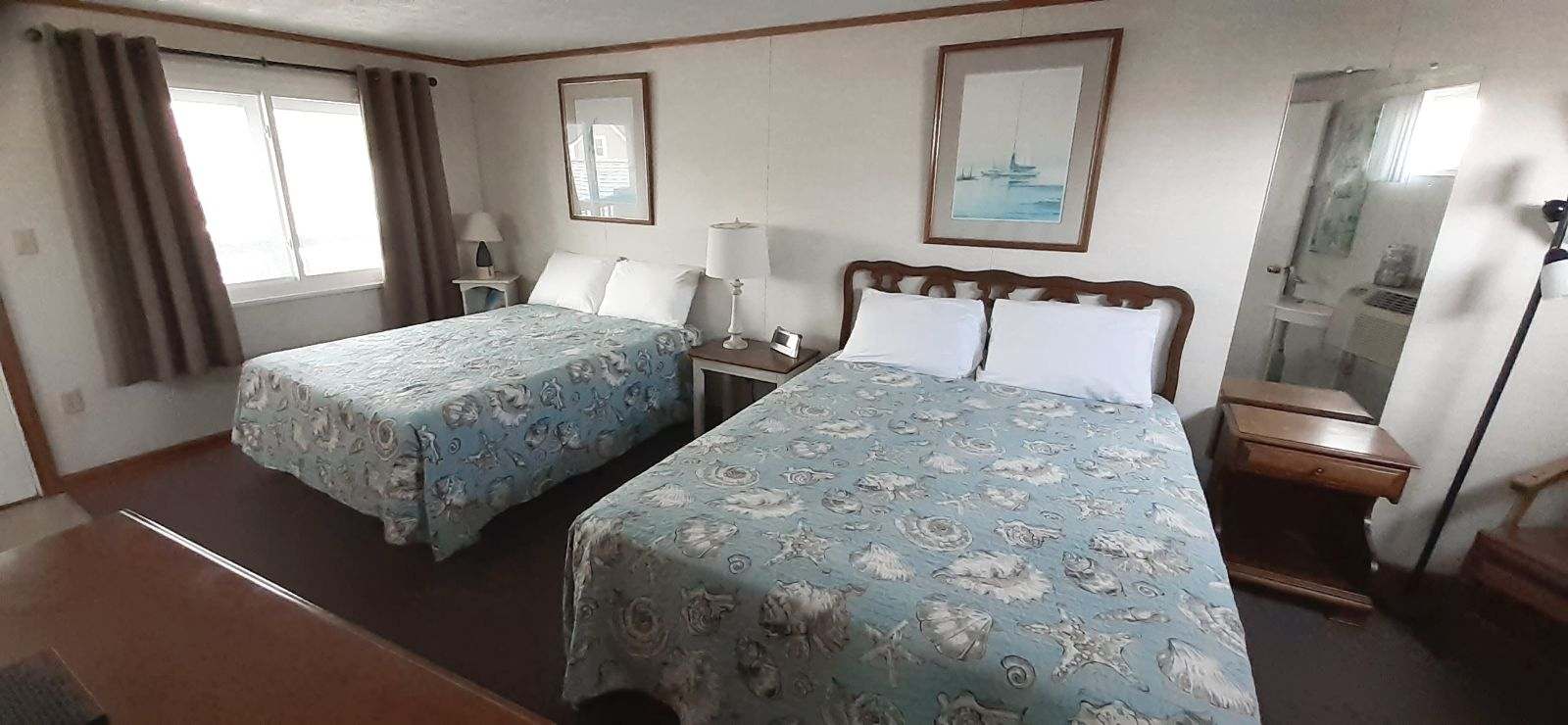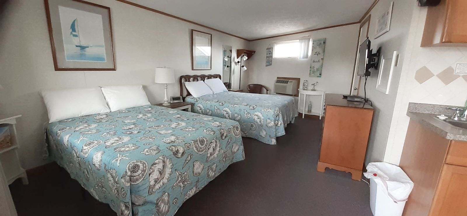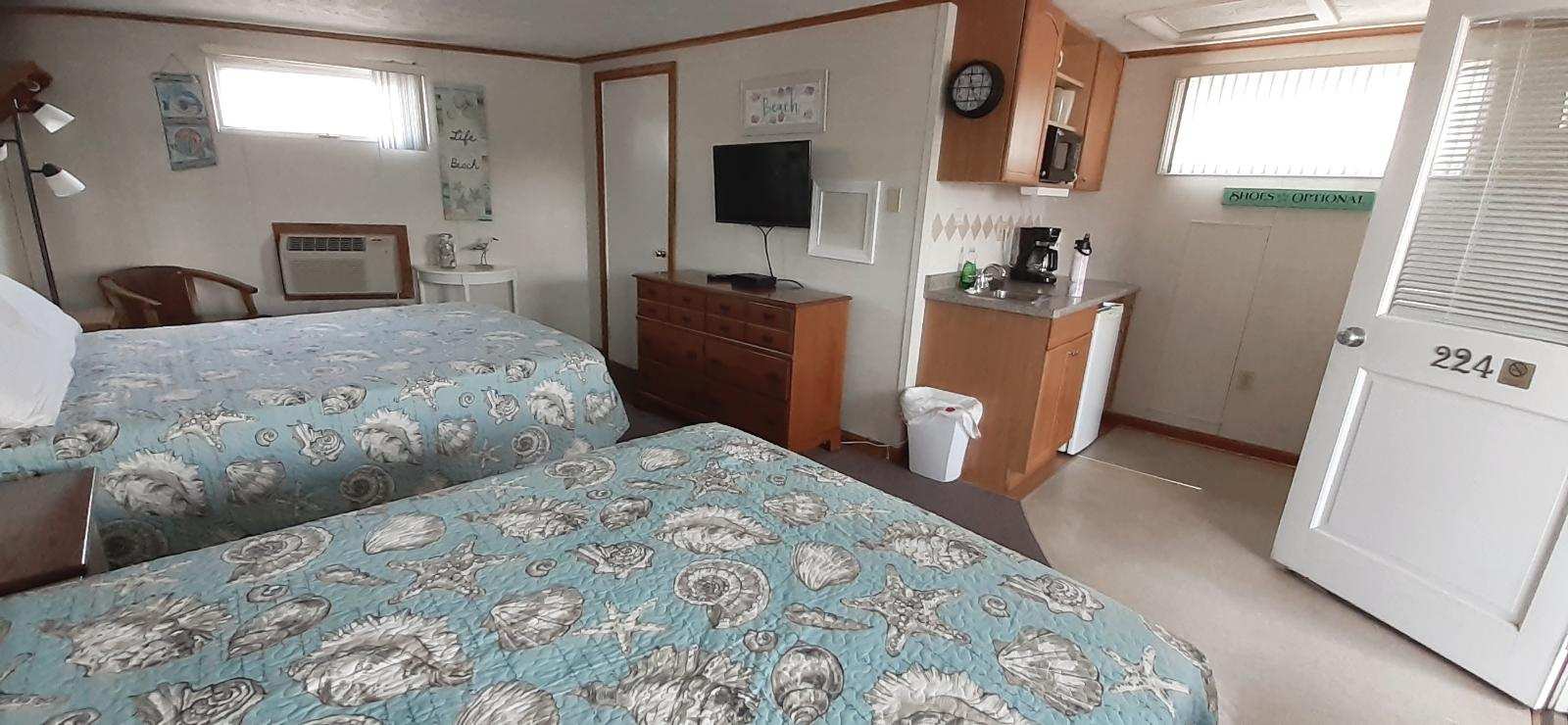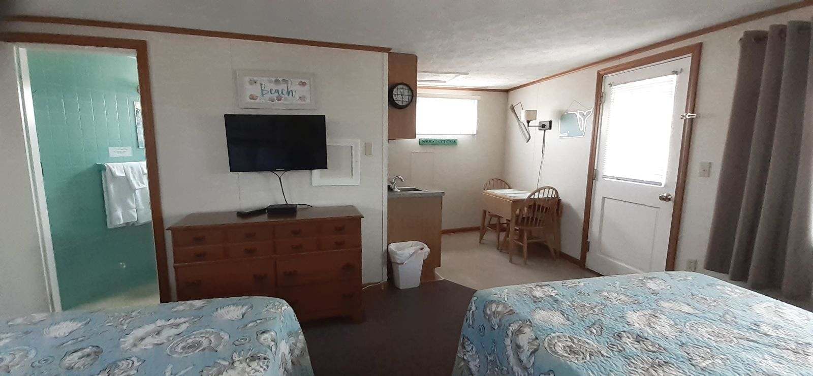 Courtyard studio unit has 1 queen bed and 1 double bed. Unit comes equipped with kitchenette, including mini-refrigerator and microwave. Color Cable TV and DVD. Full tub/shower in bath. Air Conditioned.
